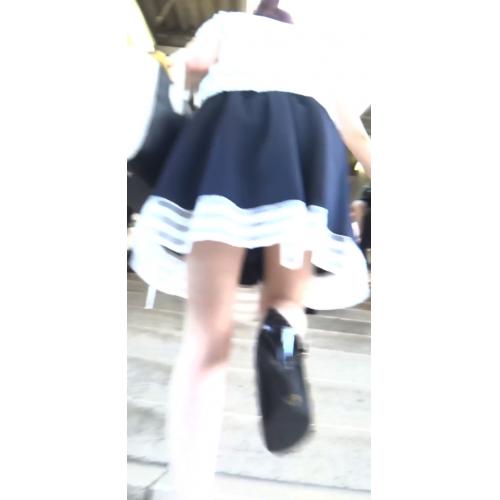 彼女は紺色のミニスカートを履いていました。このスカートは裾が広がっていて、しかもかなりフワッとしていたので今にもめくれ上がりそうな感じです。これなら上り階段でも上りエスカレーターでも背後からスカートの中を覗けそうです。これは撮ってやるしかありません。カメラを準備して彼女の後を追いかけました。