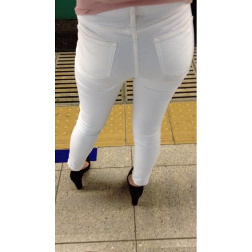 パツンパツンの白スキニーを履いたOLさん、黒パンティがはっきりと肉眼でも確認できるくらい透けてます。