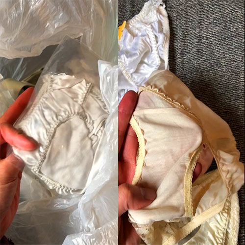 男性物の大量の服の中になぜか女性用の未使用下着が5枚ほど入っていた謎の現象をカメラに収めました