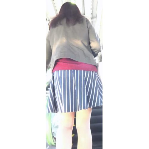 彼女はボーダー柄の紺色ミニスカートを履いていました。プリーツが弱めのスカートだったので、カメラを差し込む隙間が大きそうです。そこですぐにカメラを準備して、撮影を開始です。