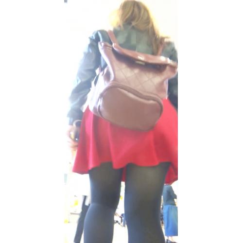 彼女は黒タイツに赤の超ミニスカートを履いていました。厚めの黒タイツを履いていたのでパンツが透けなそうでしたが、スカートあまりにもミニ丈すぎたのでちょっと興奮してしまい、やはり撮ってみることにしました。カメラを準備して撮影を開始です。