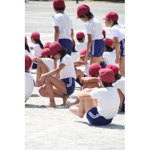いよいよ始まる組体操を前に服装を整え、靴を脱いで