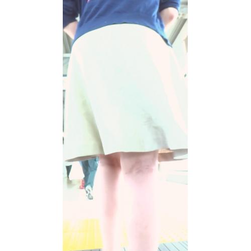 彼女はベージュ色のスカートを履いていました。スカート丈はそれほどミニ丈ではありませんでしたが、プリーツが少ないタイプのスカートだったので、カメラを中に突っ込みやすそうです。そこでカメラを準備して彼女を尾行していきます。
