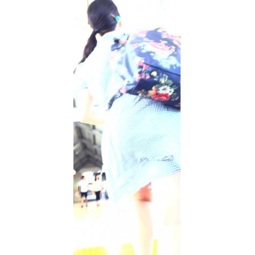 彼女は白黒チェック柄のワンピースを着ていました。このワンピースのスカートはプリーツが付いていないタイプだったので、スカートの中へカメラを差し込みやすそうです。そこでさっそくカメラを準備して撮影を開始しました。彼女を背後から尾行していきます。