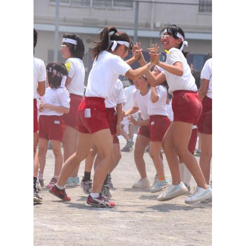 競技中を含めハチマキのみ着用で赤白帽を