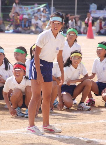 前半はエンジの短パン、後半は青の短パン。